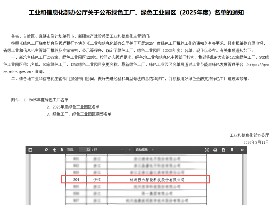 近日,工业和信息化部正式发文,公布2025年度绿色工厂、绿色工业园区名单,公司凭借在绿色智造、节能环保及低碳运营领域的出色表现,成功入选“国家级绿色低碳工厂”,这是对公司长期践行绿色发展理念的国家级认可,也是公司落实“双碳”战略的重要里程碑。
